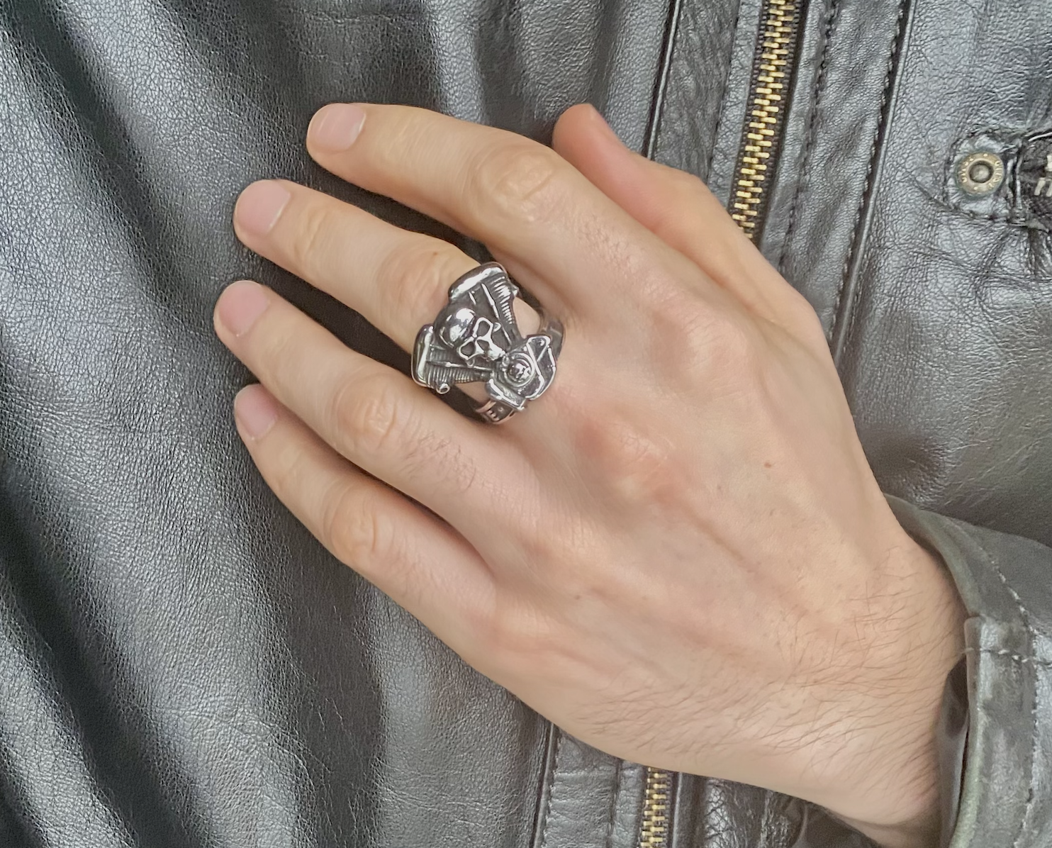 Gefertigt aus hochwertigem Edelstahl, bietet der Ring sowohl außergewöhnliche Langlebigkeit als auch robustes Design. Die detailreiche Darstellung eines Motorradmotors, ergänzt durch einen eindrucksvollen Totenkopf, verleiht diesem Schmuckstück eine einzigartige und kraftvolle Ausstrahlung.